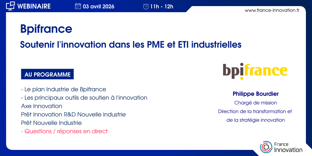 Au programme : Le plan Industrie de Bpifrance Les principaux outils de soutien à l’innovation : -Axe Innovation -Prêt Innovation R&D Nouvelle Industrie -Prêt Nouvelle Industrie Questions / Réponses